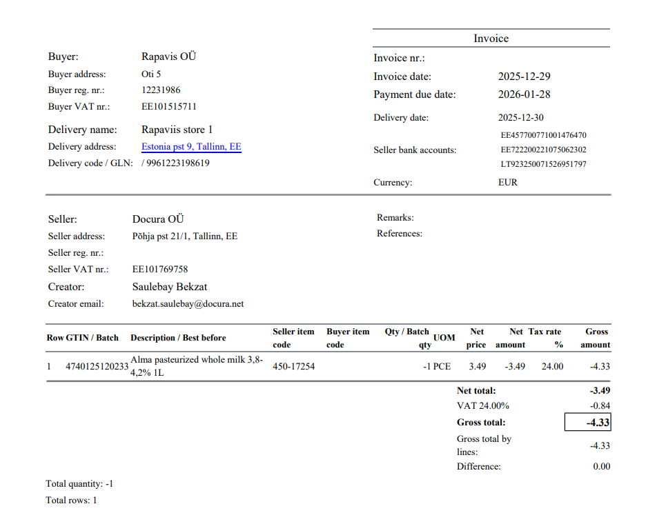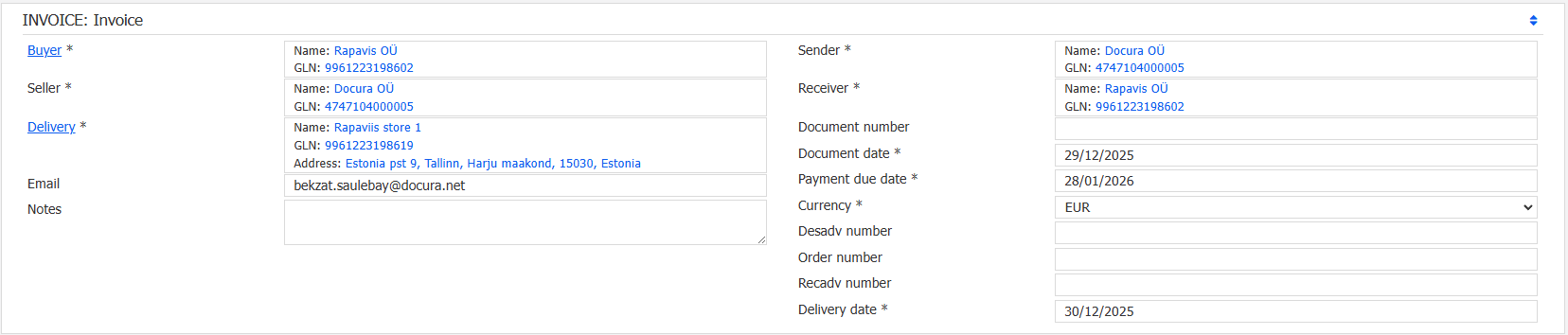 - Parties – Buyer, Seller and Delivery address fields identify the trading partners (e.g. Rapavis OÜ as buyer, Docura OÜ as seller, and a specific store as delivery location).