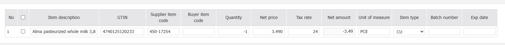 - Net price: 3.490 EUR; with quantity -1 this becomes net amount -3.49 EUR.