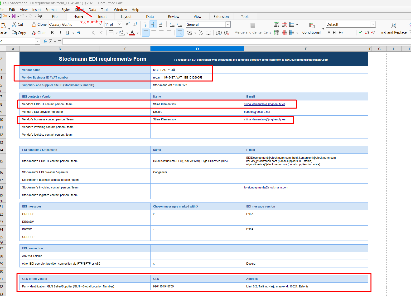 - You must download the "Stockmann EDI requirements form_ Baltics.xlsx" (available in the Files section at the bottom of this page), fill it in with the partner's data rename it replacing Baltics with reg number of the company