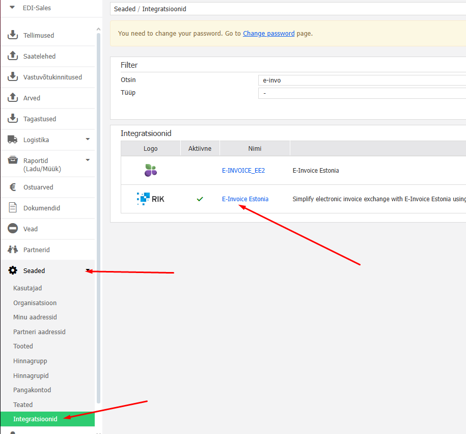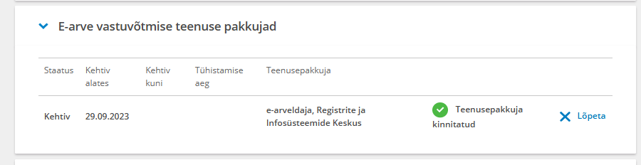 E-arve vastuvõtmise teenusepakkujad" peatüki all vali e-arveldaja ja kinnita.- Pärast kinnitamist kuvatakse staatus: