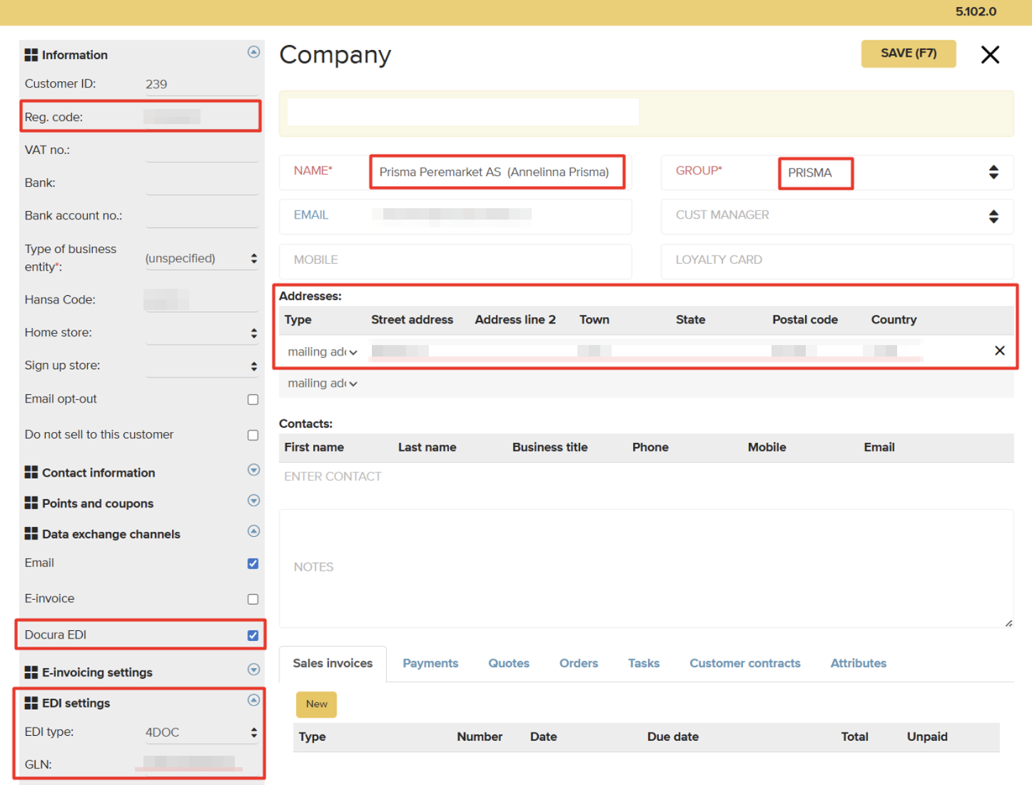 - Märgitud on linnuke Docura EDI juurde, kuid väli E-invoice email address jäeti tühjaks, kuna klient on registreeritud e-arve saajana.