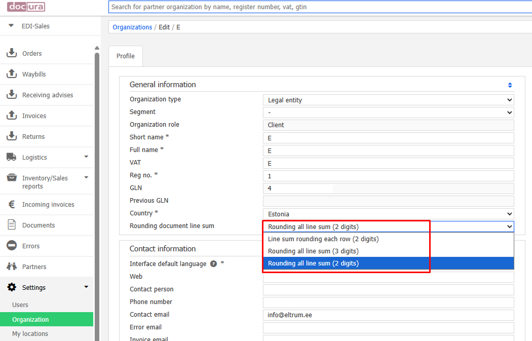 - Profile (Profiil) jaotises leidke parameeter Rounding document line sum (Dokumendi rea summa ümardamine).