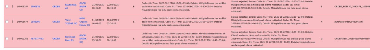 - Põhjus: Kliendiandmed olid puudulikud või muutunud pärast saatmist, mistõttu süsteem tellimust töödelda ei suutnud.