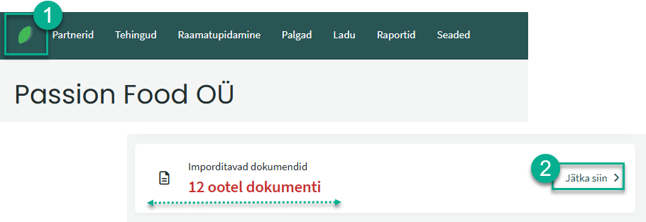 - Klõpsata SimplBooks'i logol (lehekese ikoonile) ja seejärel nupule "Jätka siin" imporditavate dokumentide juures.
