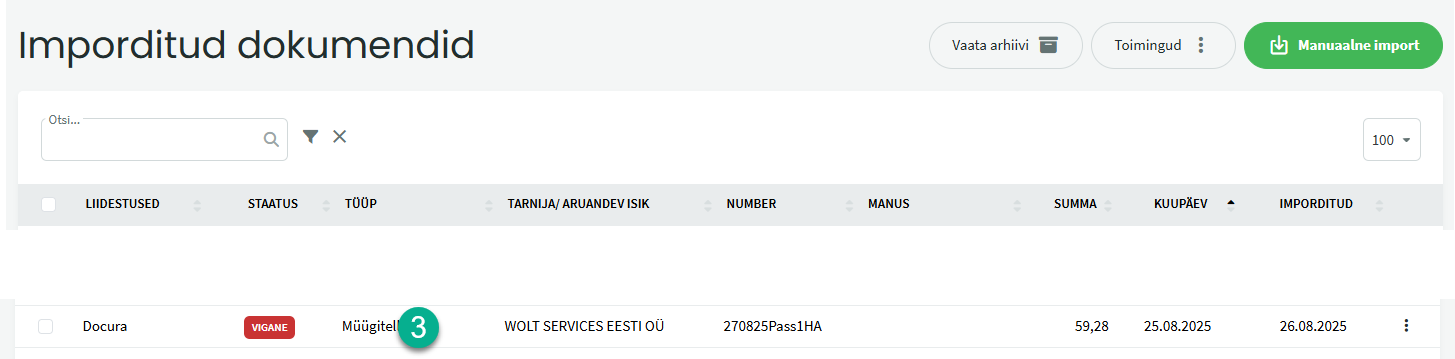 - Kui tellimust ei õnnestu automaatselt importida, klõpsata sellel dokumentide nimekirjas.