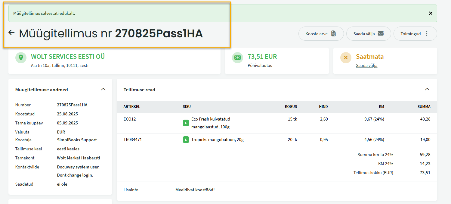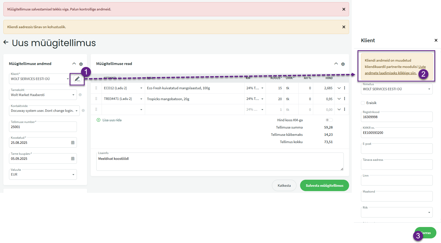 - Pärast kliendiandmete uuendamist salvestada tellimus — import lõpetatakse edukalt.