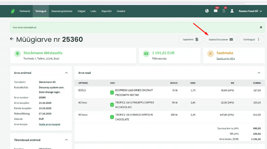 Pärast edukat aktiveerimist käivitub igaöine dokumentide automaatne import Docurast. Kontrolli Tehingut - Müügitellimused